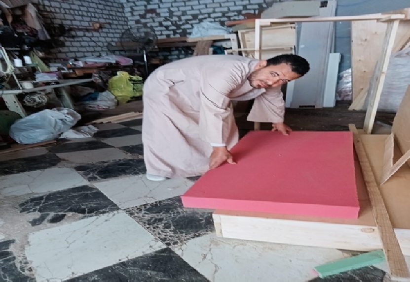 Il vit dans le village de Tahnsha, un village très pauvre. Il souffre d'une légère polio à la jambe droite. L'association l'aide en lui fournissant les médicaments nécessaires et en lui apprenant le métier de menuisier. Il possède un petit atelier de menuiserie pour la fabrication de salons. Il nous a demandé de développer son atelier et de l'aider à acheter des matériaux (bois, éponges, outils de fabrication de salon et tissus) pour fabriquer davantage de produits en bois et les vendre à sa communauté. Nous avons constaté que ce projet était très bénéfique pour lui et sa famille. L'association lui a accordé environ 15 000 livres égyptiennes pour l'achat d'éponges en bois, d'outils de fabrication et de tissus pour la production de nouveaux produits en bois. Il a convenu avec lui de payer la moitié de la somme sur un an. Il travaille désormais bien et réalise une importante production de bois. Signature de l'expert : Kamal Zaki